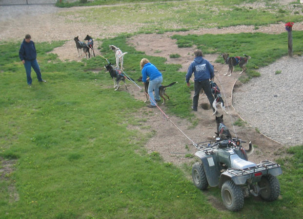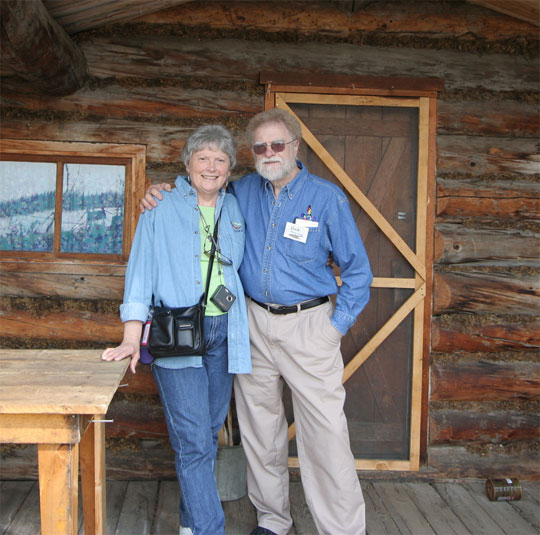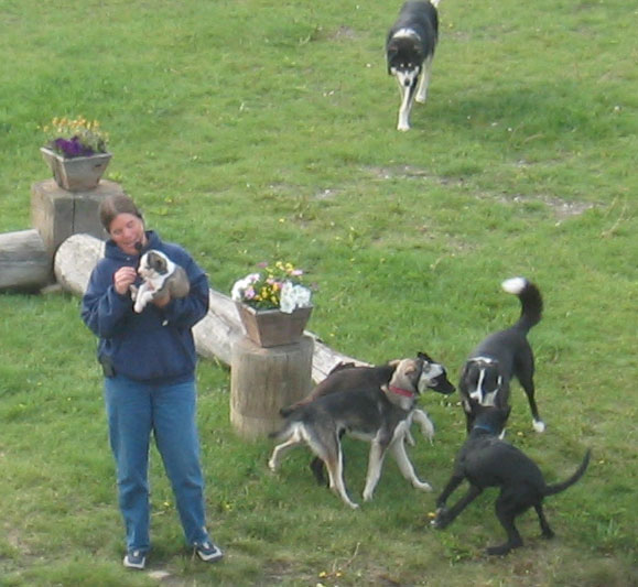 Susan Butcher (4 time winner of Iditarod Race) at her kennel with her dogs and spouse David