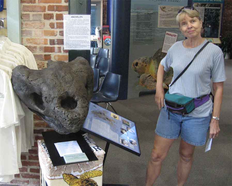 A reproduction of the head of Archelon, a fossil bone skeleton. The live weight of an Archelon ischyros is estimated at more than 4,500 pounds and over 70 million years old