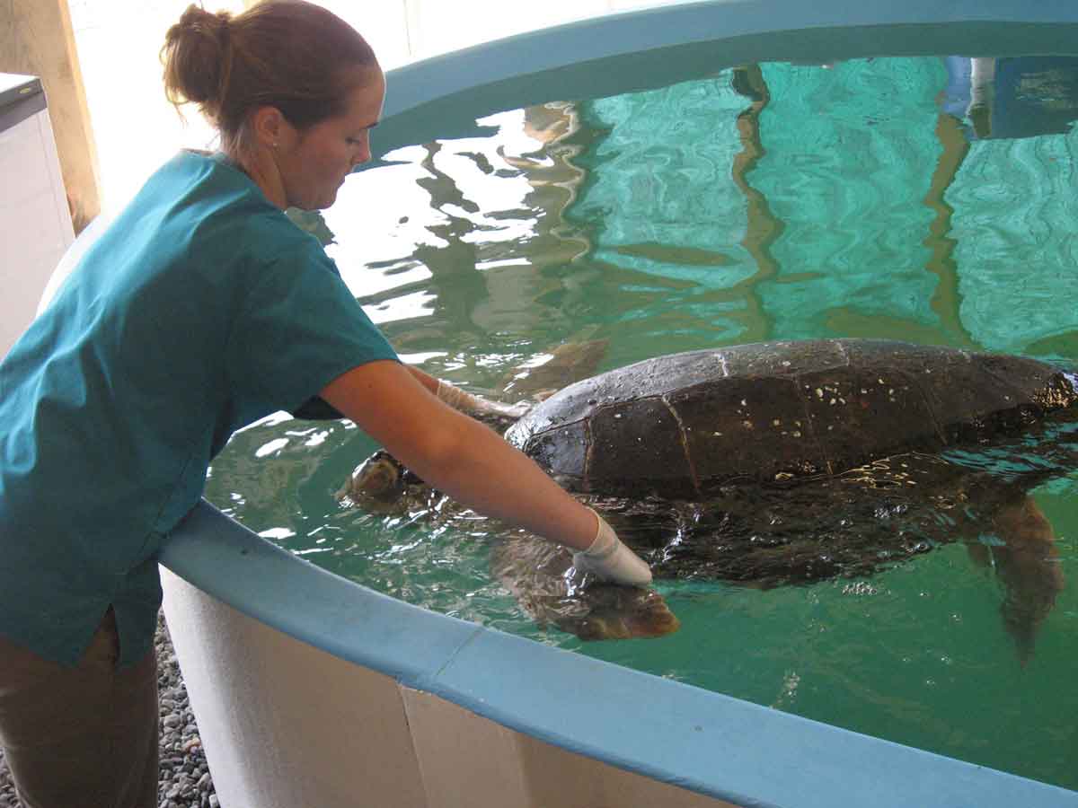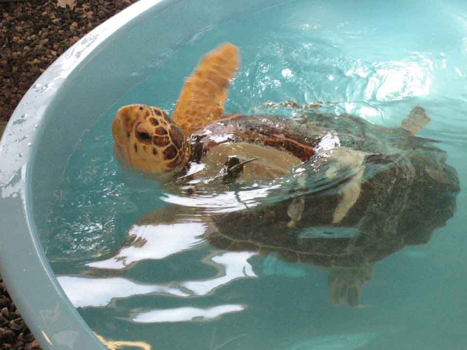 This turtle (Griffin), also injured by a passing boat, is being taught how to use its flippers to dive for food