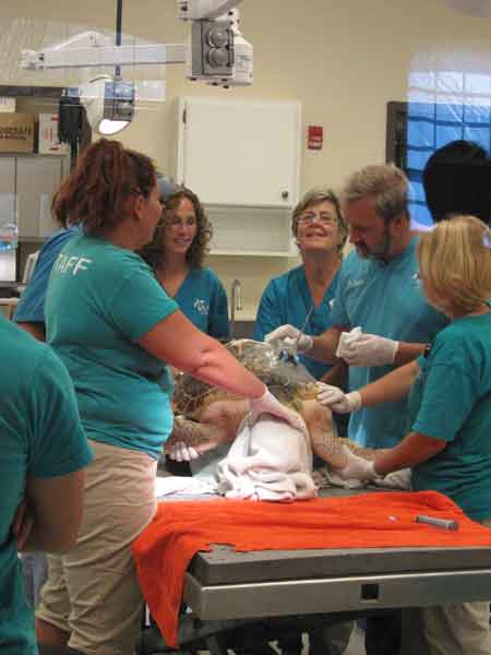 Below is Gale, a Loggerhead rescued after being injured by a passing boat. In process is the installation of a tracking device on its back. Upon release into the sea, they will be able to study his/her travels. A towel is held over its head to help keep him/her calm.