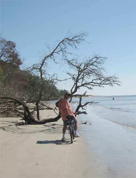 The first night we grilled steak at our campsite--we had to try out our new Coleman stove! Then we were able to set up our chairs inside the netting-covered "porch" of our tent, and sit sipping a glass of wine, without concern about bug bites. The second night we ate at Sea Jay's at the South end of the island, and had their low-country boil with Kentucky bourbon pecan pie--a gorger's delight!