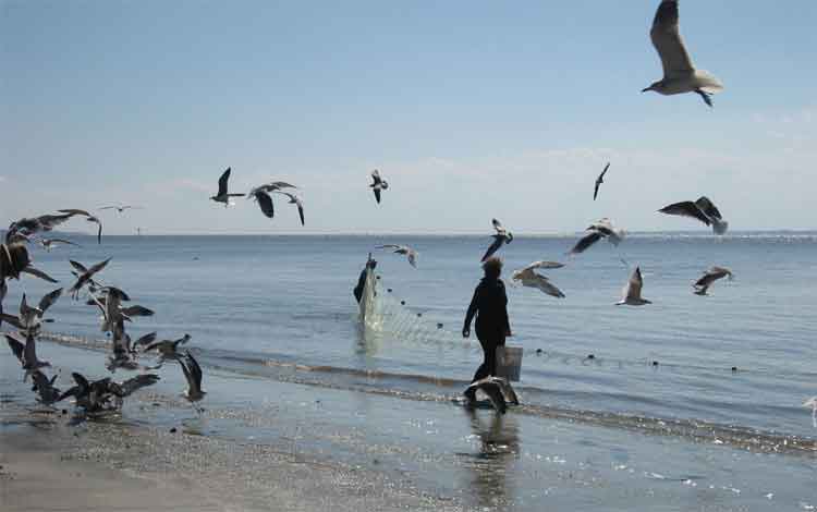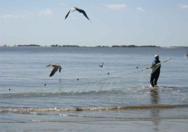 At the South end of the island, at St Andrews beach, we encountered numerous folks shrimping with large nets, one person at each end, and often another, with a stick, to scare off the dolphins which would attempt to join in the catch!