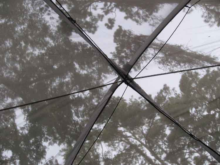 Here's a view from the floor of the tent--on a warm night, there's no need for the covering fly and we can gaze at the stars before falling asleep.